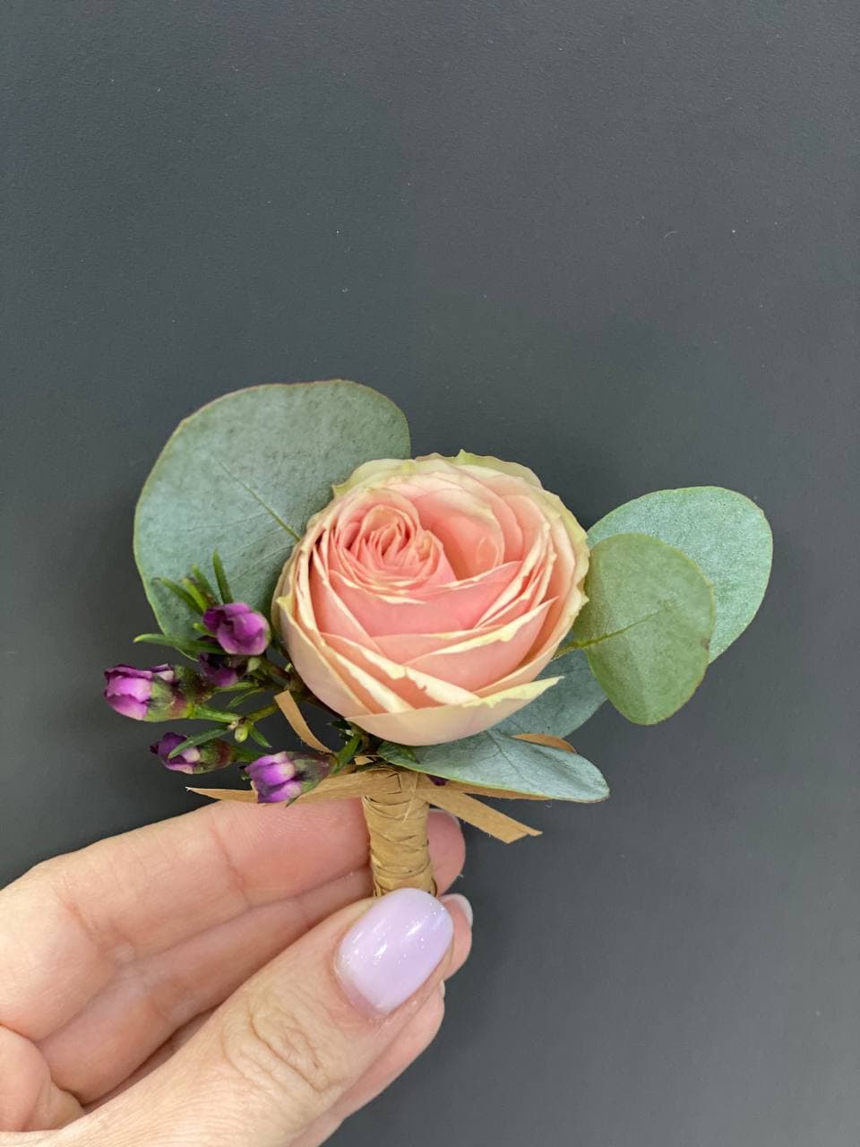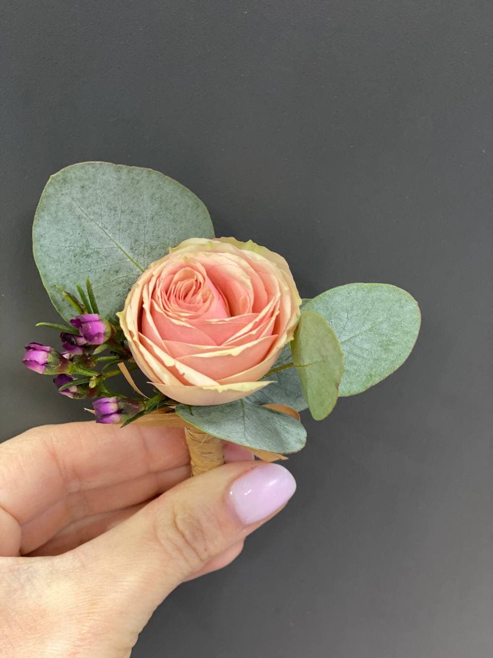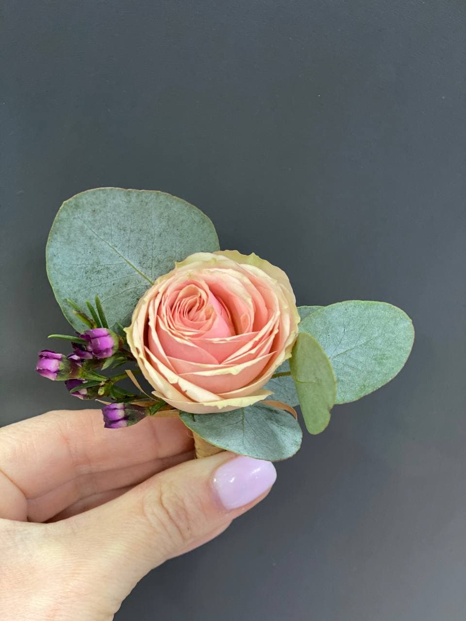 Роза кустовая, хамелациум, эвкалипт, лента, булавка